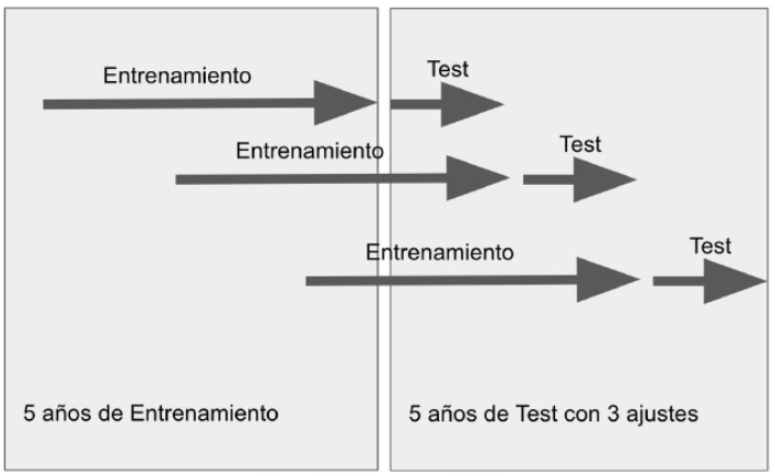 Una de las formas para evaluar la calidad de la estrategia es mediante la validación secuencial (walk-forward), divide en ventanas de tiempo con las que entrena y valida.